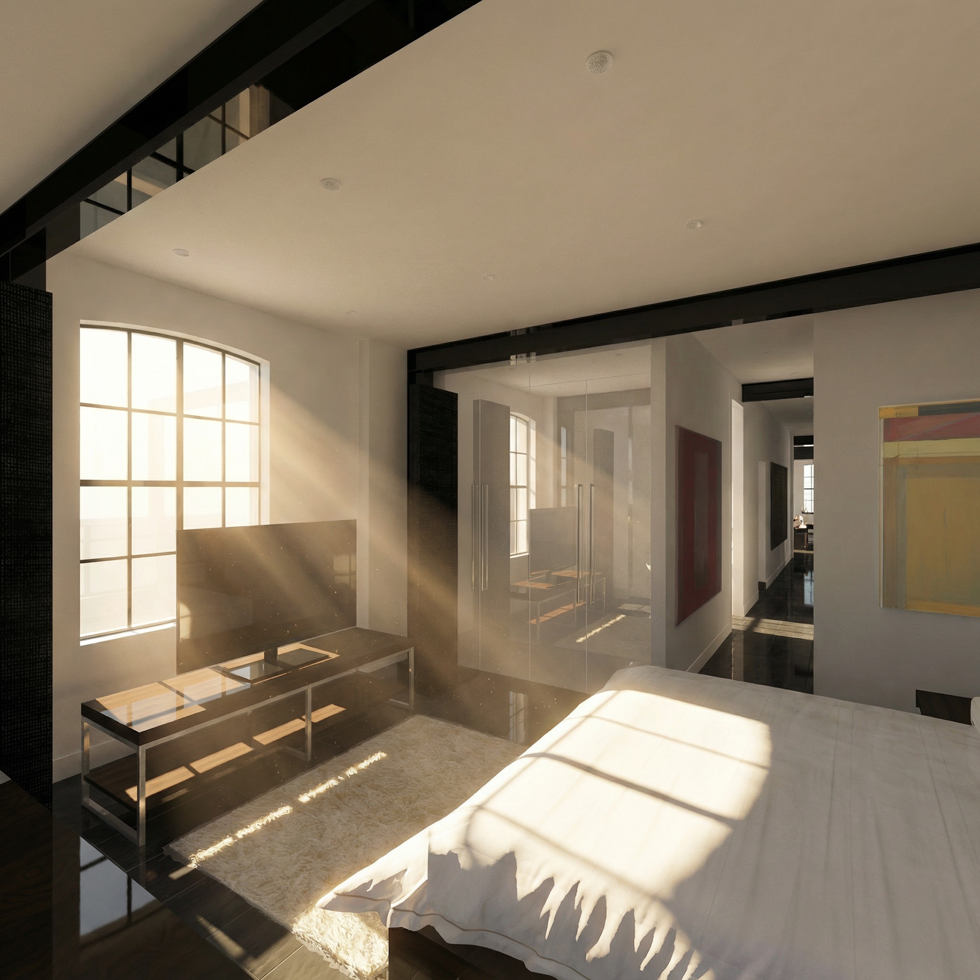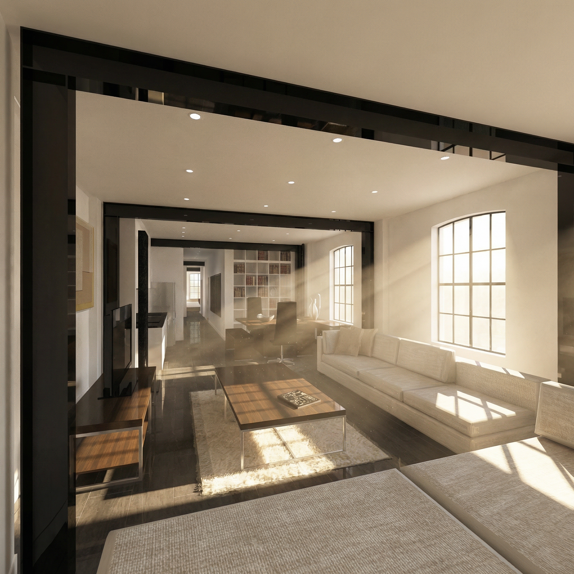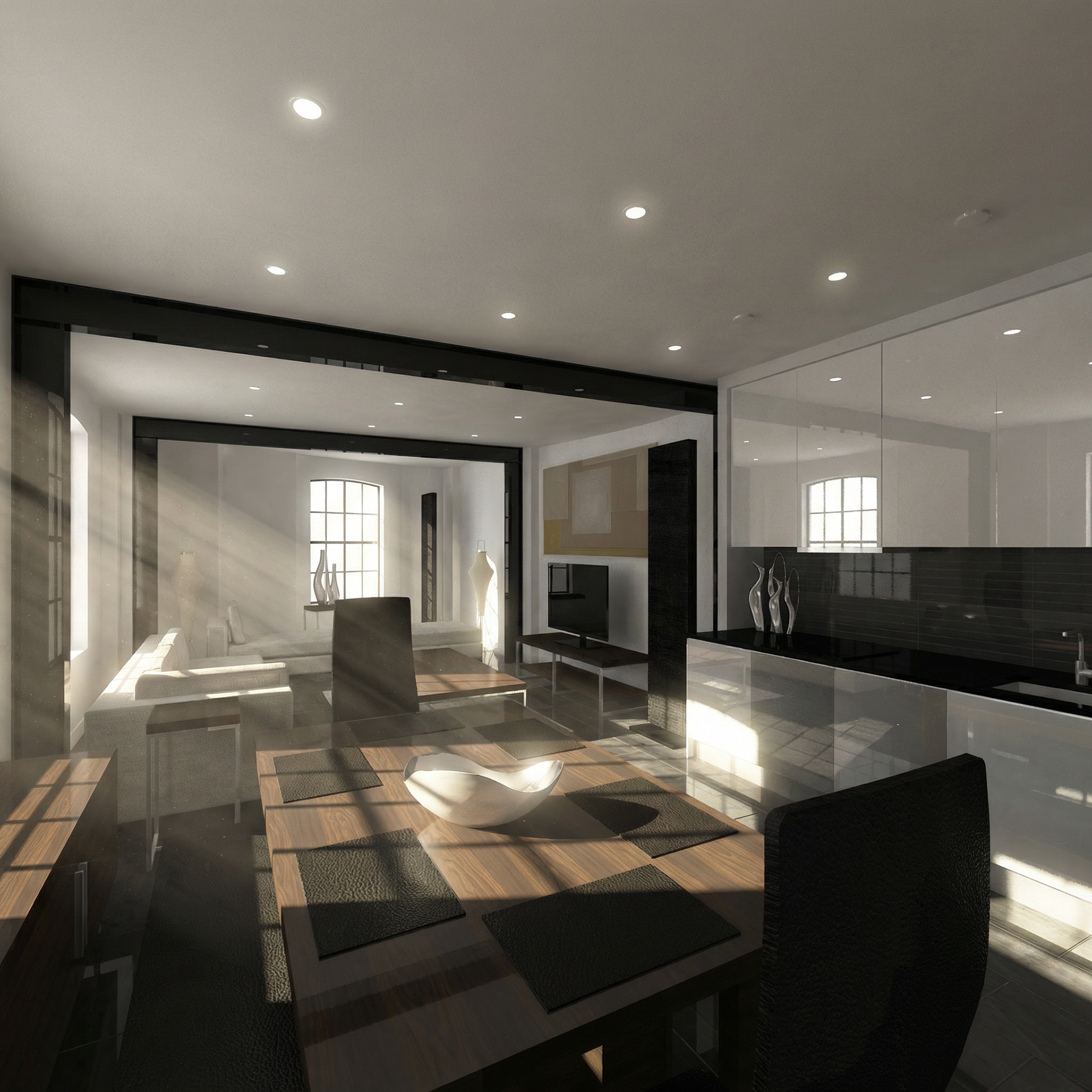 The previous renovation to create a residential space, whilst functional and based on the codes at the time, compartmentalised the space such that it lost its warehouse-like charm and sense of openness and light. The central design idea of the proposed renovation is to open up the communal spaces and simplify the entry sequence, bringing a greater extent of natural light through-out the flat and allowing the internal frame structure to become a regulating feature for the spaces. The existing enclosed kitchen is removed to create an open-plan, kitchen, living, dining space, enhancing the functionality of the southern end of the property taking advantage of the 3m high ceilings and tall Crittall windows. The northern part of the flat is reconfigured from a one bedroom suite to a two bedroom and ensuite arrangement, again improving the functionality and allowing the natural light from the northern end of the flat to flow into the entry and circulation spaces.