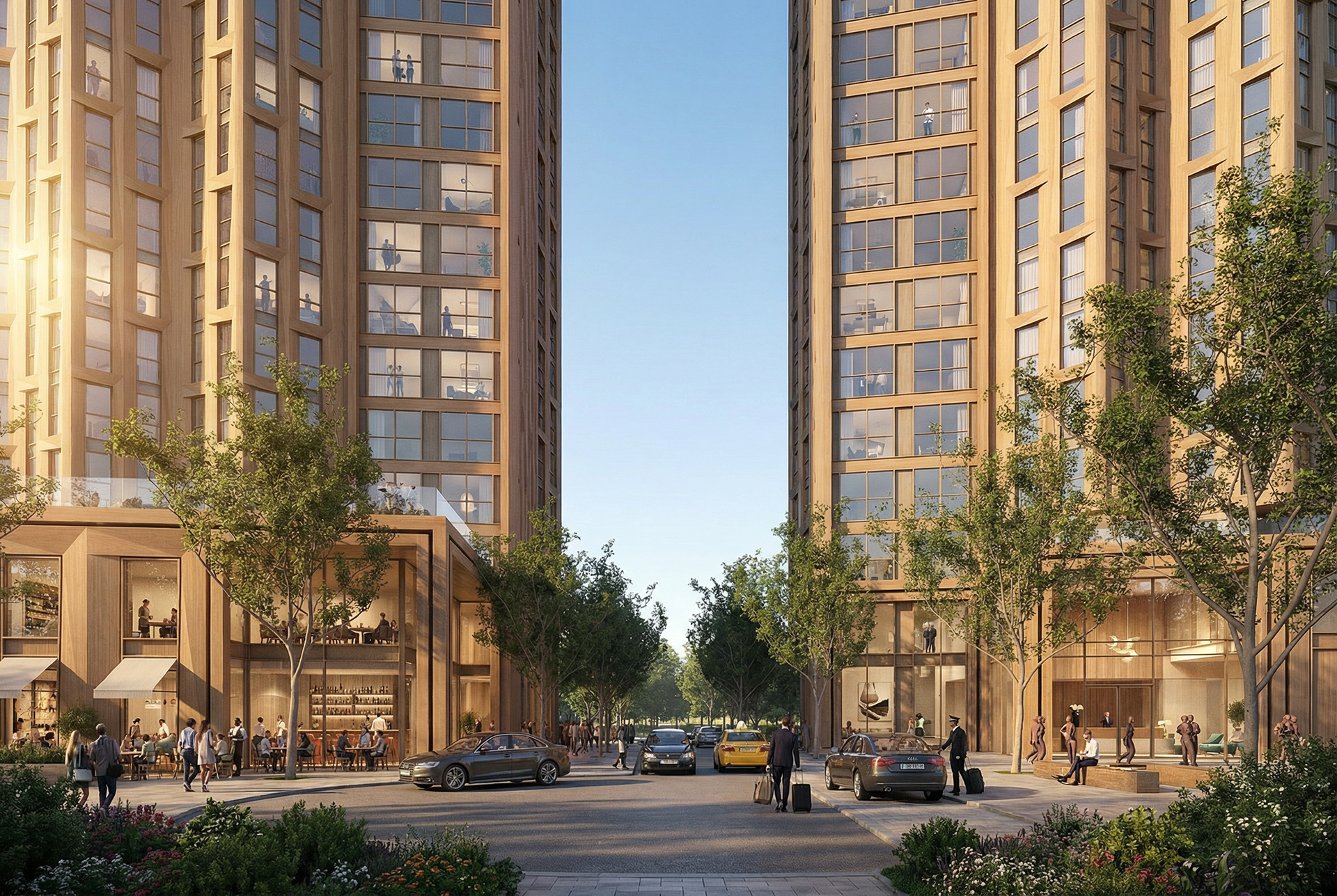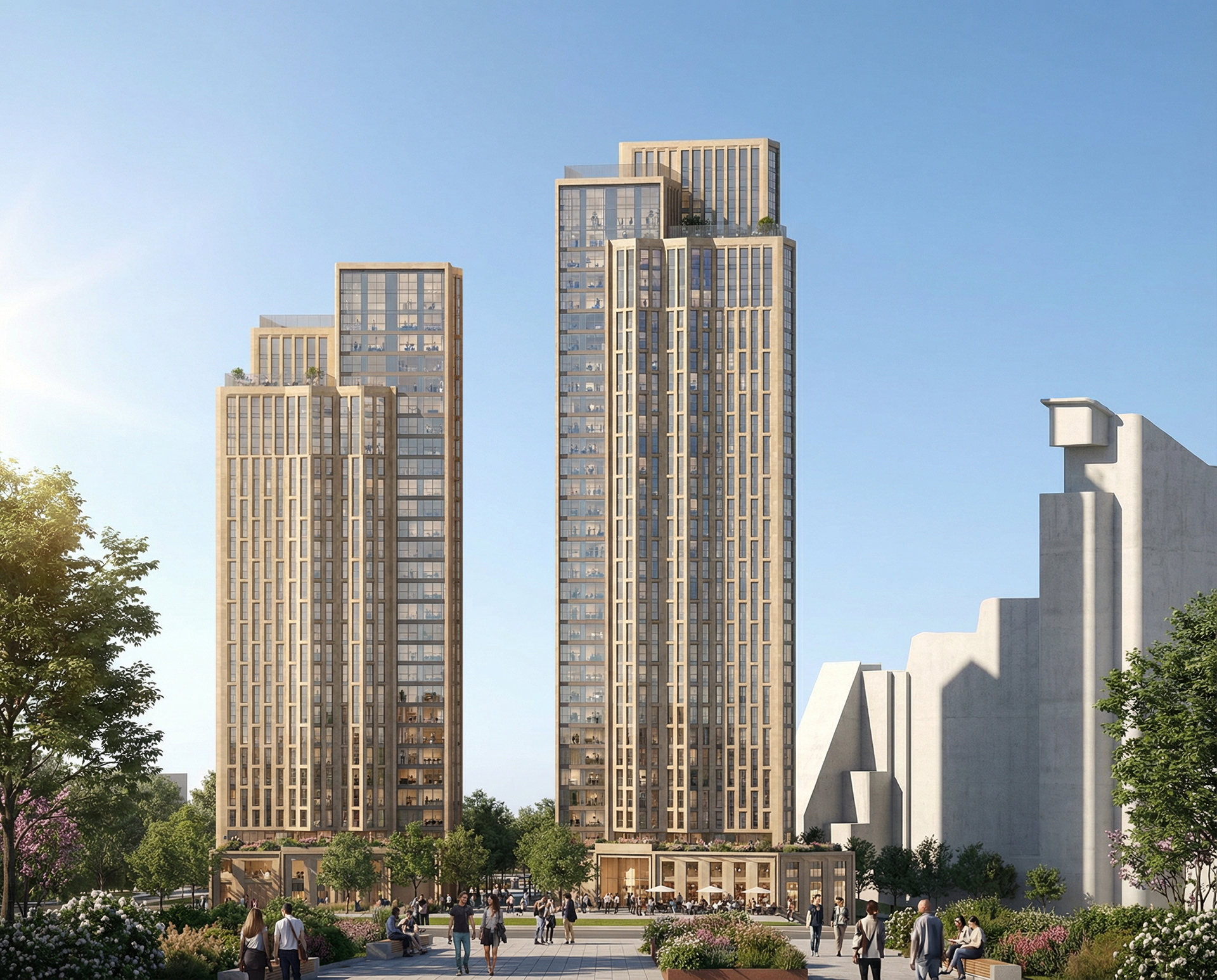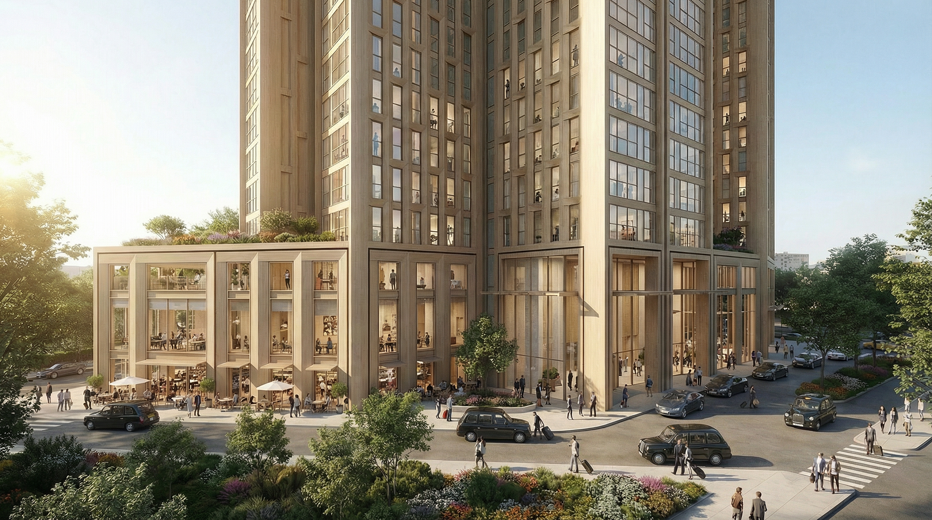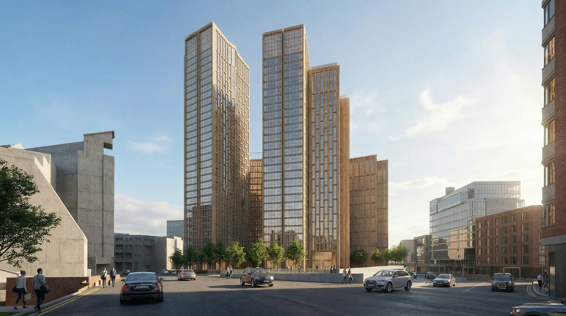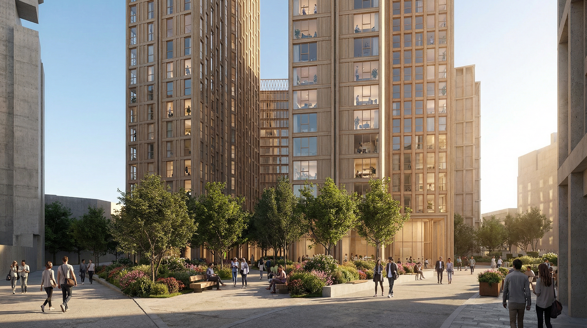 The towers are envisaged as a tectonic composition of bronze and silver folded metal, responding to the historical nature of the site as a Victorian Railway Works. Stepped podiums provide community facilities, outdoor communal terraces and active frontages connected to the established public spaces of the masterplan. The ends of the L-shaped plans are large framed areas of floor to ceiling glass with operable openings creating semi-outdoor space oriented towards the key views. Folded metal panels on the other facades create a deep, insulated wall providing privacy from the surrounding buildings with operable openings for cross-ventilation. The folded metal facade changes scale to create the building base and top.