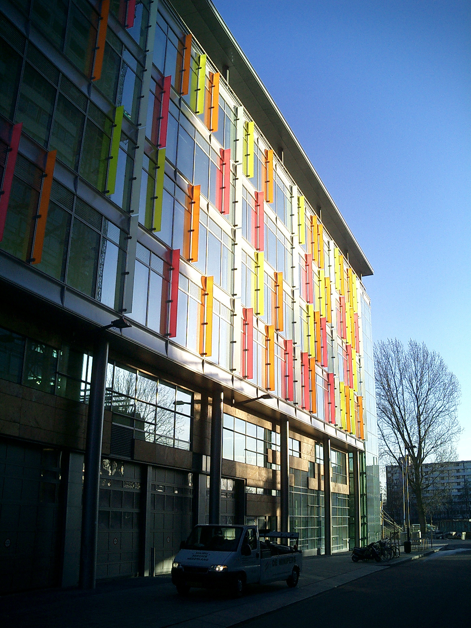 The south façade features a six-storey atrium space sheathed in a glass façade supported by cabled truss columns. Featured in the atrium is the volume of the creche extending to the south façade glass plane, creating a dynamic architectural form floating within the space. Programmatic elements of the project become objects lodged into the building massing, wrapped by a crisp exterior façade layered by horizontal and vertical elements. This layering, coupled with a varied sense of hierarchy and proportion, cleanly illustrates an interlaced complexity of program and function. The Mondrian inspired sedam roof pattern brings together the ideas of layering, colour and shifted rectilinear geometry.