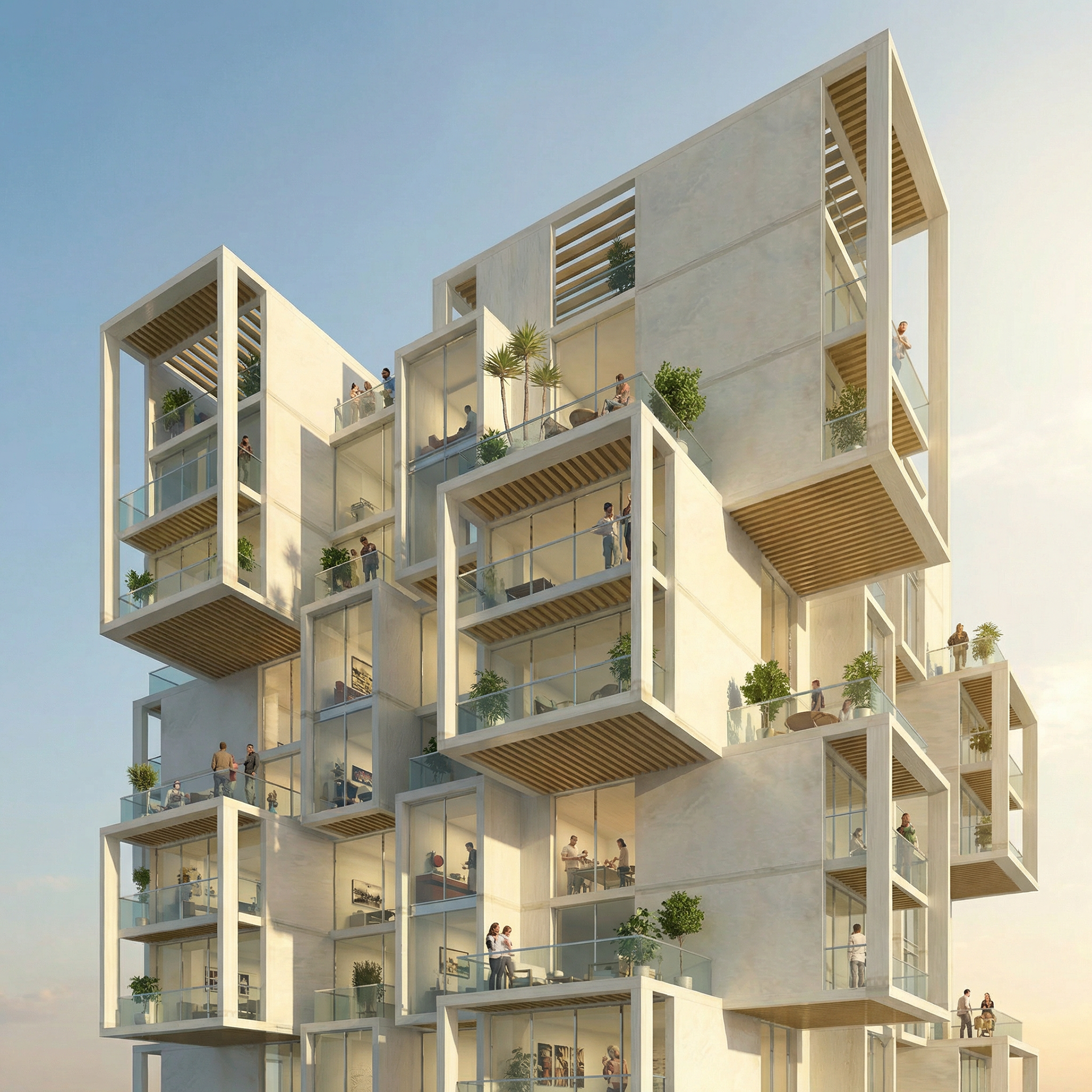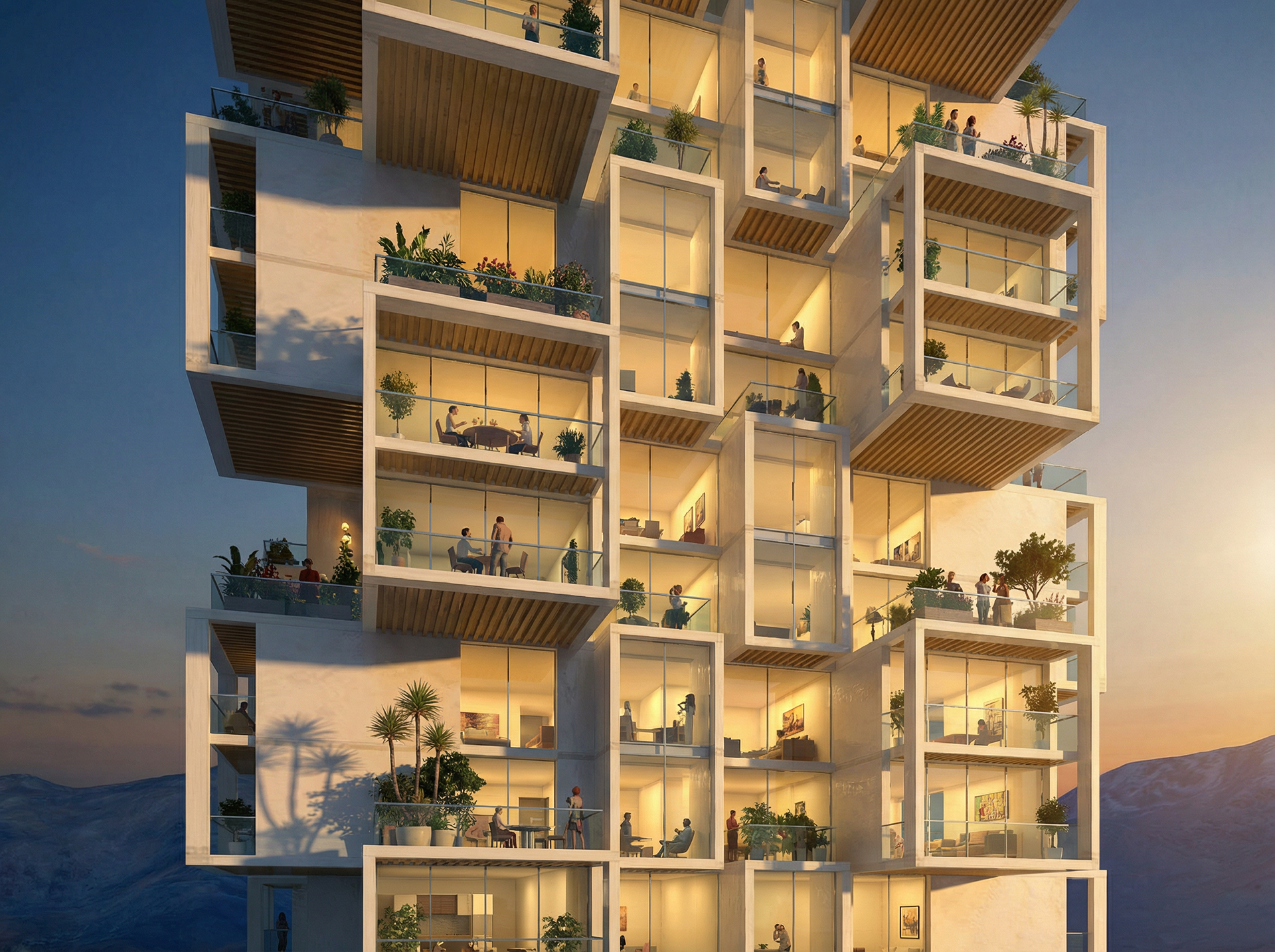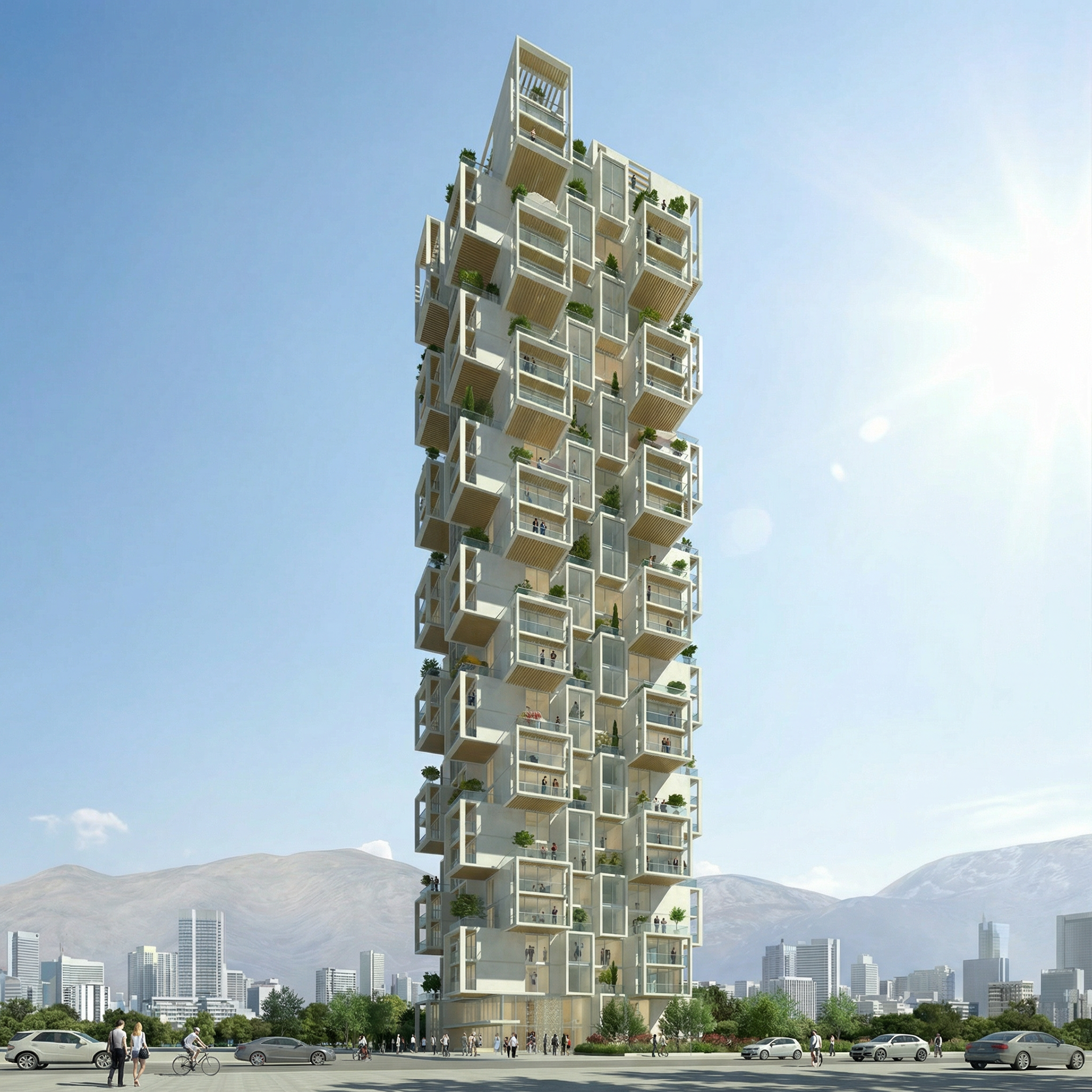 The Residential Prototype Tower is an experimental building designed to improve modern high-rise living. The building is conceived with each apartment considered as a home, with a generous footprint, significant terrace garden space, privacy and inspiring views of the city and/or landscape. The prototype focuses on creating landmark buildings through the strategic manipulation of optimised spatial modules. The modules themselves are designed as ideal living spaces with abundant natural light, generous open plan living spaces connected to outdoor terraces and well proportioned bedrooms and bathrooms. Structurally the modules are arranged around a central core and pinwheel wall armature that allows for various pre-fabrication options to be considered, potentially improving quality control and reducing construction time.